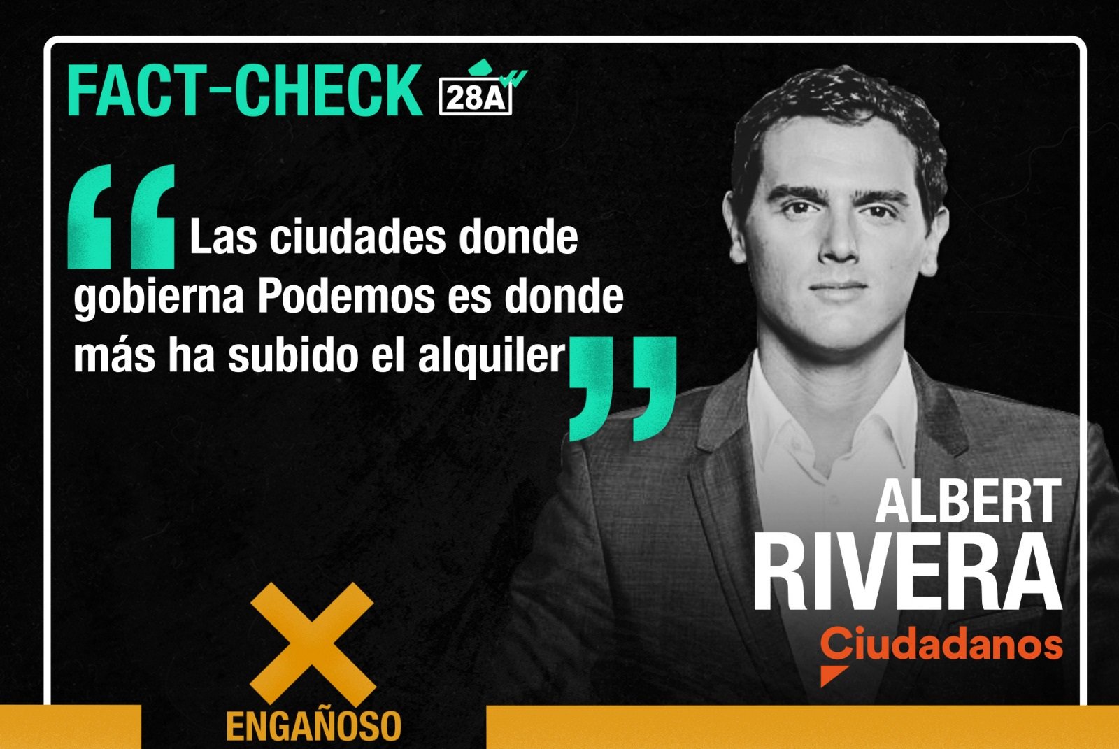 Albert Rivera aseguró: «En las ciudadanos donde gobierna Podemos es donde más ha subido el alquiler». Es ENGAÑOSO. Málaga o Sevilla están entre las que más ha subido y no gobierna Podemos. Más ejemplos aquí.