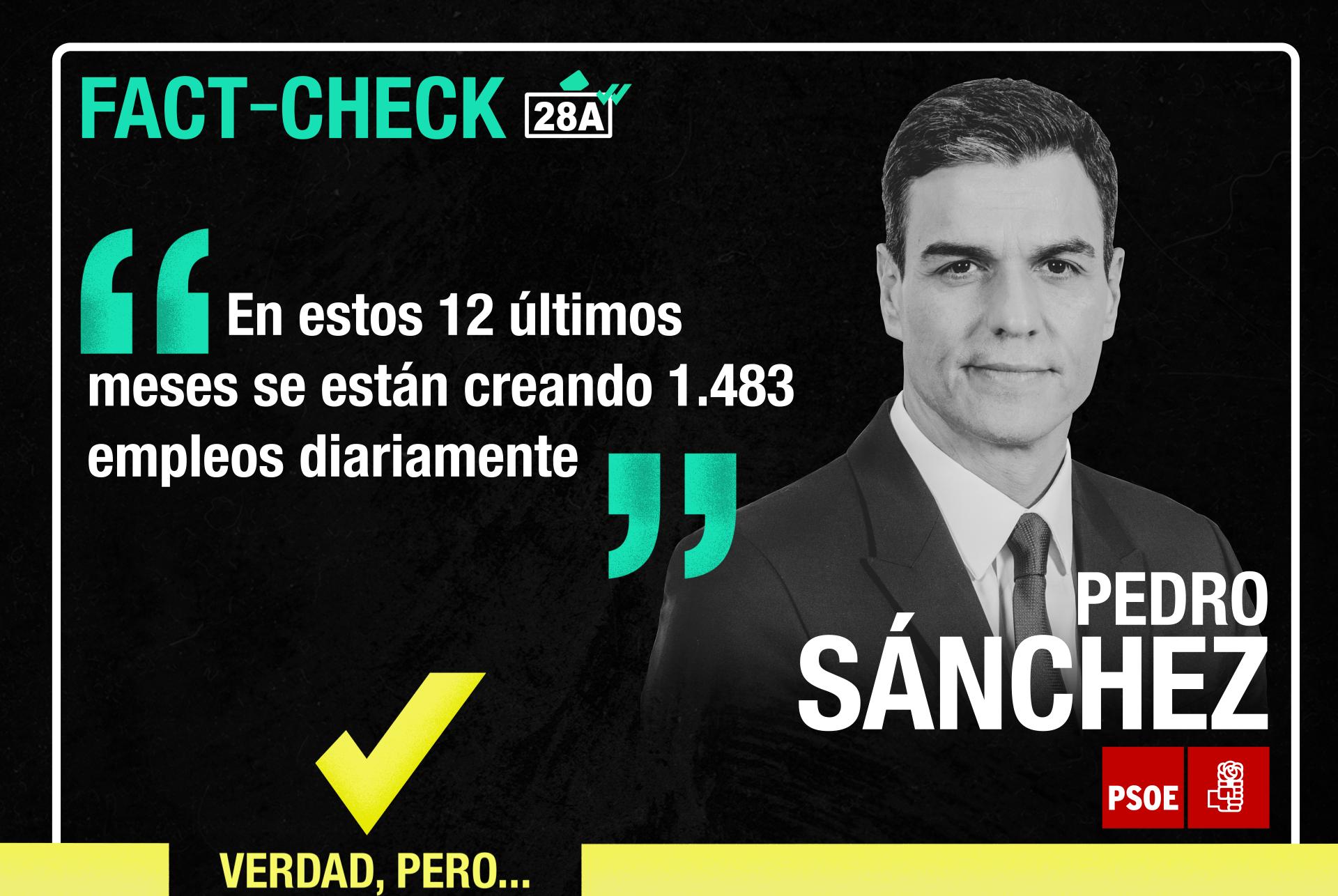 Pedro Sánchez reiteró lo que dijo en el debate del día anterior respecto al empleo: “En estos últimos 12 meses se están creando 1.400 empleos diarios”. Es VERDAD, pero el PSOE gobierna desde hace 10 meses. Aquí los datos.