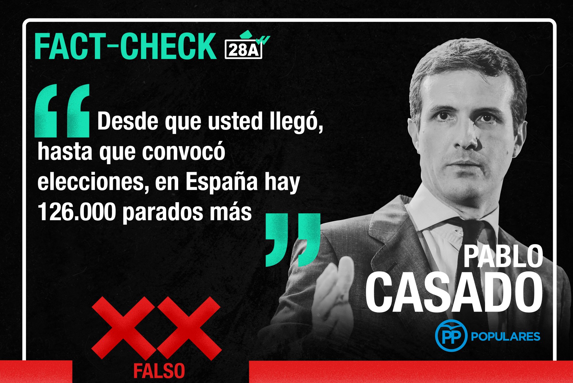 Siguiendo en la línea del empleo, Casado le dijo a Sánchez: “Desde que usted llegó hasta que convocó elecciones, en España hay 126.000 parados más”. Es FALSO, los datos no dicen eso. Aquí toda la información.
