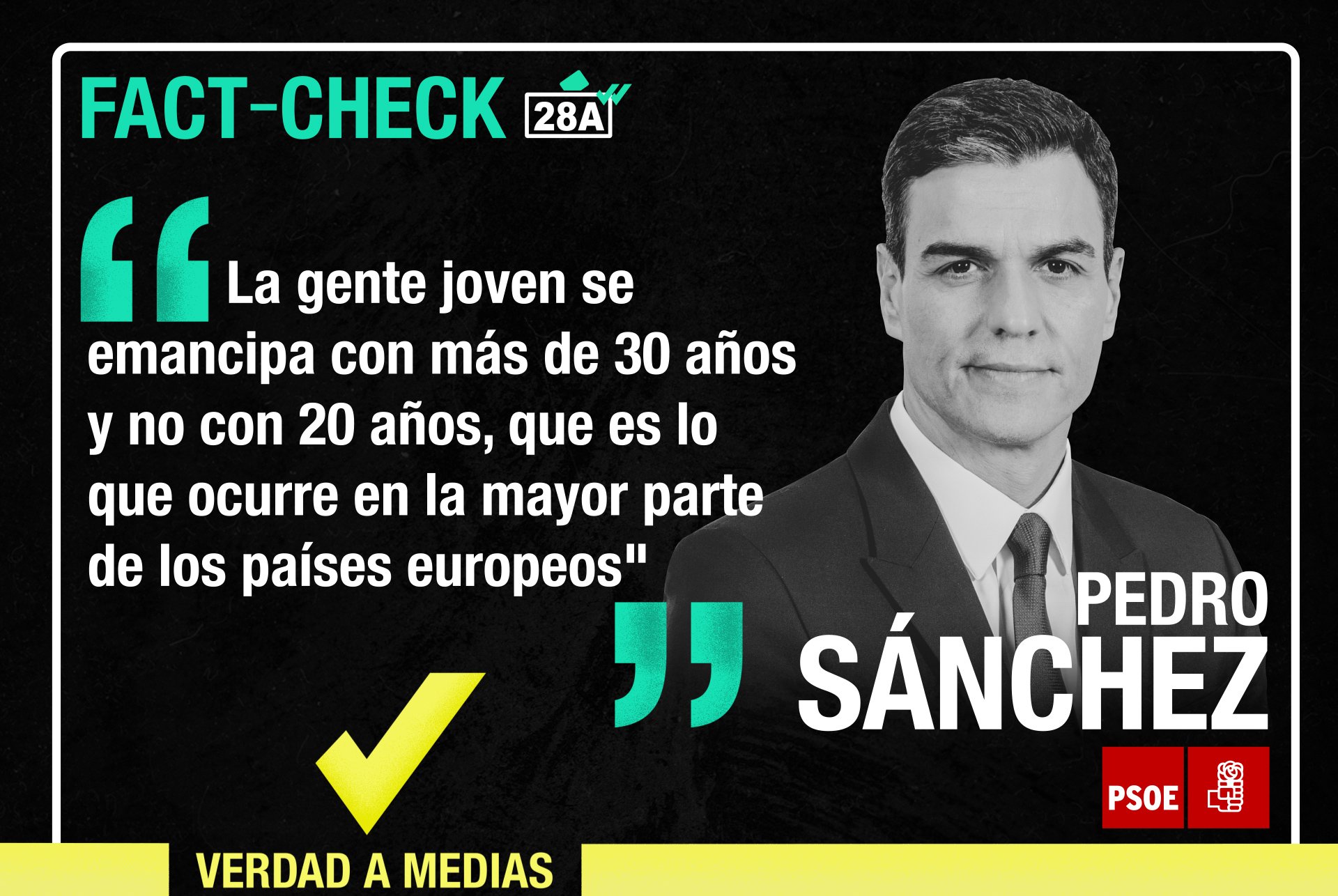 Según Sánchez, en España la gente joven se emancipa “con más de 30 años y no con 20 años, como ocurre en Europa”. Este argumento es VERDAD A MEDIAS. La media europea es 26 años. Los datos aquí.