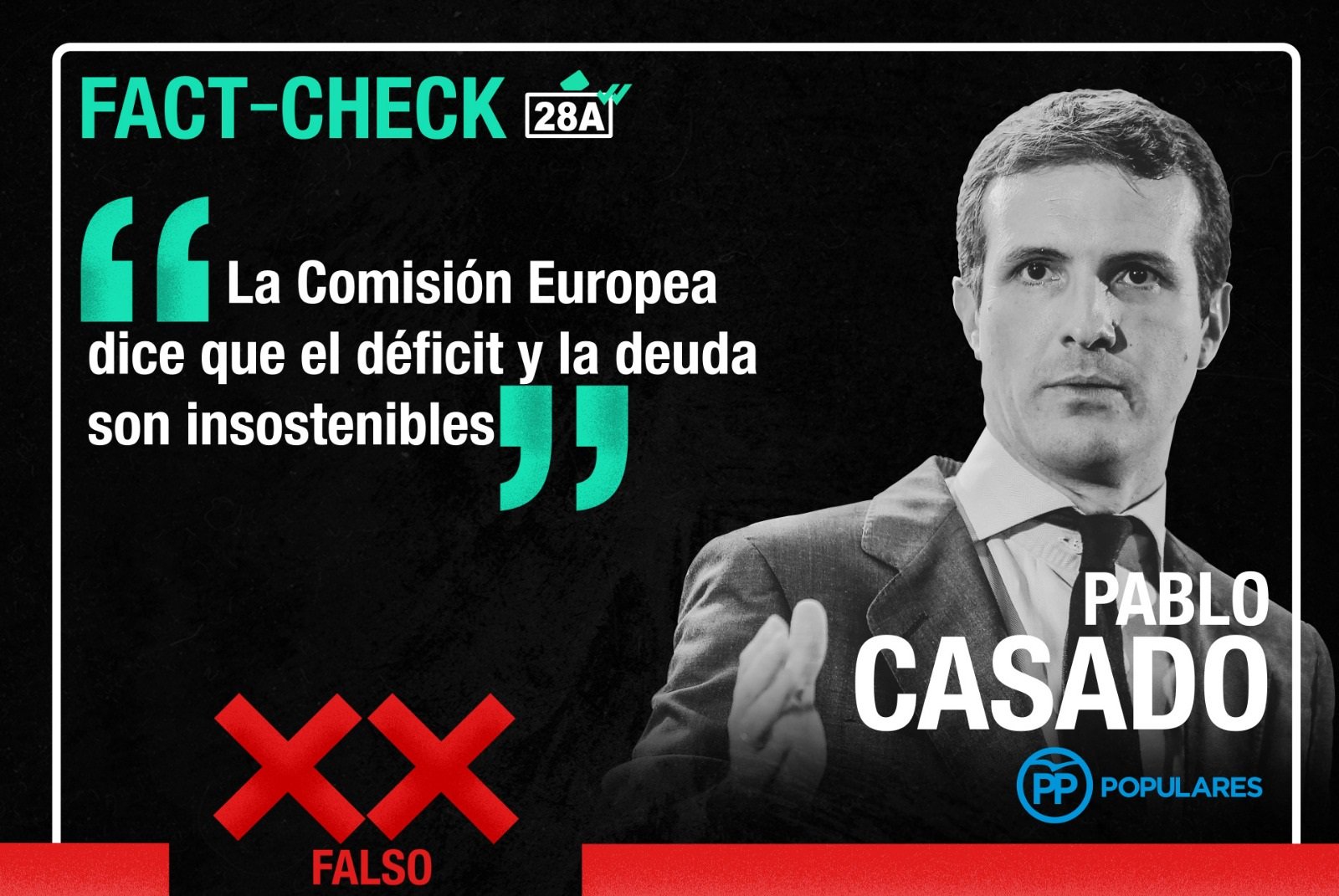 Durante el debate, Casado afirmó que, sobre España “la Comisión Europea dice que el déficit y la deuda son insostenibles”. Es FALSO. El informe de la CE no dice eso. Lo explicamos aquí.
