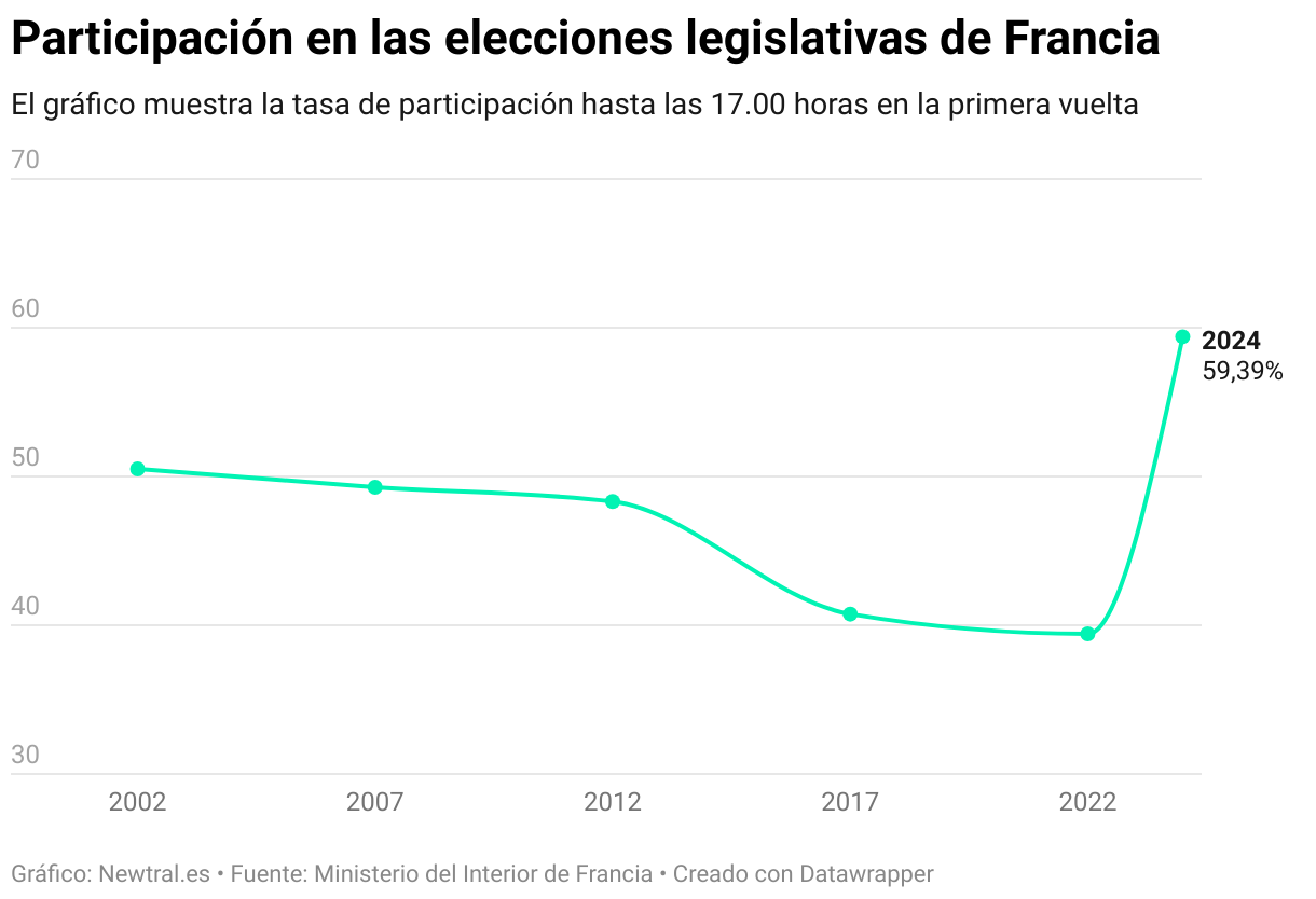 La cantidad de franceses que está acudiendo a las urnas este domingo no se había visto en lo que va de siglo. La tasa de participación hasta las 17.00 horas en la primera vuelta de las elecciones legislativas de Francia ha sido del 59,39%, casi 20 puntos más que en los comicios de 2022. Las encuestas ya habían vaticinado que la participación aumentaría. Estos sondeos también dan como ganador al bloque ultraderechista Agrupación Nacional, de Marine Le Pen.