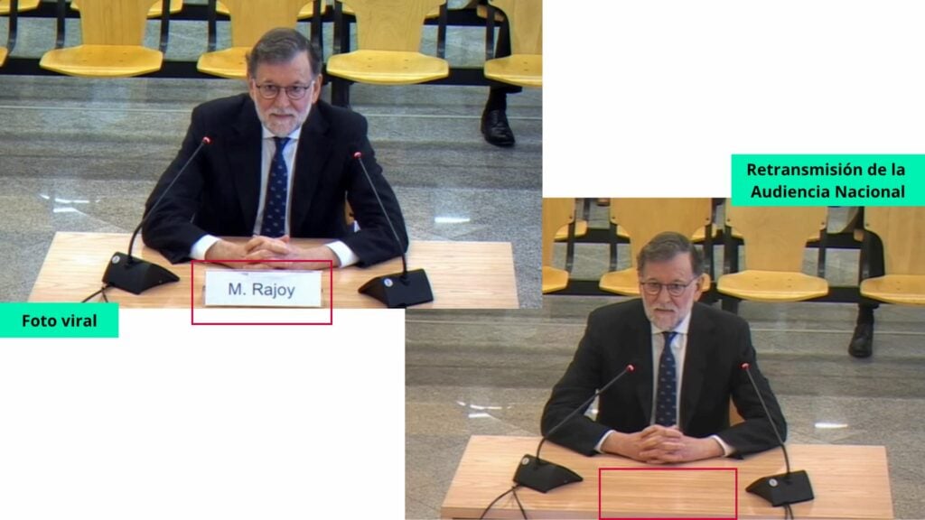 Circula por redes sociales una imagen del expresidente del Gobierno, Mariano Rajoy, declarando en la Audiencia Nacional con un cartel sobre la mesa que indica “M. Rajoy”. “Los de la Audiencia Nacional son unos cachondos o se cachondean de nosotros”, señala un post. Pero se trata de un bulo: la foto está manipulada.