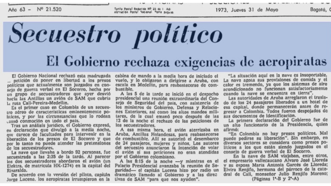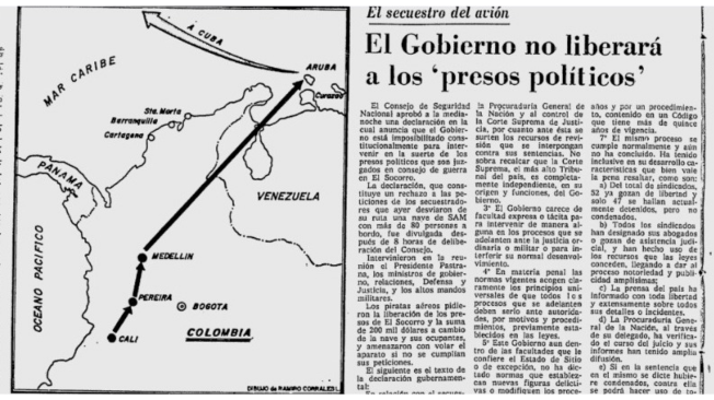 - La negociación. El gobierno no se negó a negociar con los secuestradores por ser terroristas, sino que deliberó y, tras un análisis jurídico, concluyó que estaba imposibilitado constitucionalmente para intervenir en la liberación de los presos de El Socorro y que, por tanto, no podía atender las pretensiones de los secuestradores, como recoge El Tiempo.