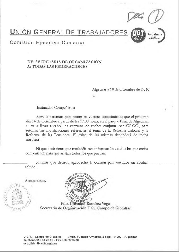 Sin embargo, la UGT Campo de Gibraltar desmintió que este documento fuese cierto. En un comunicado publicado en su página web en 2018, el sindicato indicó que este documento se trataba de un montaje a partir de una circular publicada en diciembre de 2010 para la realización de una “caravana de coches conjunta con CCOO para retomar las movilizaciones referentes al tema de la Reforma Laboral y la Reforma de las Pensiones”.